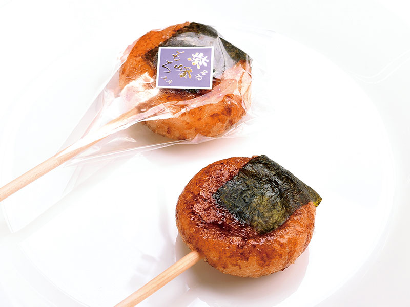 団子生地を丸く平らにして油で揚げた後、醤油ダレを刷毛で塗り、醤油パウダーをまぶし、海苔をのせてから串に刺しています。醤油は土浦市の柴沼醤油醸造製造のものを使い、味を濃いめに仕込みました。醤油ダレをたっぷり付けるとしっとりしてしまうため、醤油パウダーも加えて食感のカリカリ感を残せるようにしました。串に刺して、おやつ感を出しました。