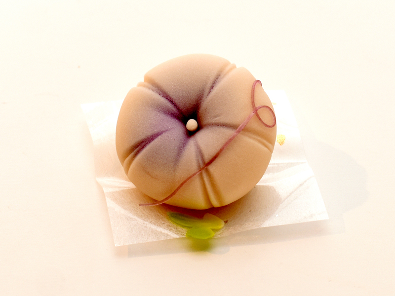日本ではあまり花を咲かせないといわれる、幻のさつまいもの花をヌーベル上生菓子(ヌーベル=新しい、新時代の)で表現しました。 滑らかな口当たりのシルクスイートをオーブンでじっくりと焼き上げ、焼芋に仕立てました。 その風味にフランス産発酵バターを合わせ、コクのある焼芋餡に仕上げています。 中には、柚子がほのかに香るクリームチーズと白餡を合わせた餡を忍ばせました。焼芋の香ばしい風味と、爽やかなクリームチーズのコントラストが広がります。 見た目は和菓子ならではの職人の技が映える上生菓子でありながら、味わいは洋菓子のような素材の調和を感じていただける、他にない〝幻のヌーベル上生菓子〟です。