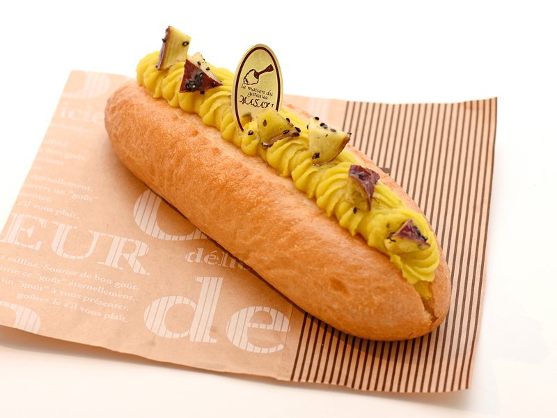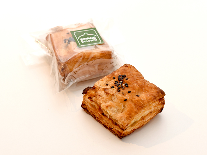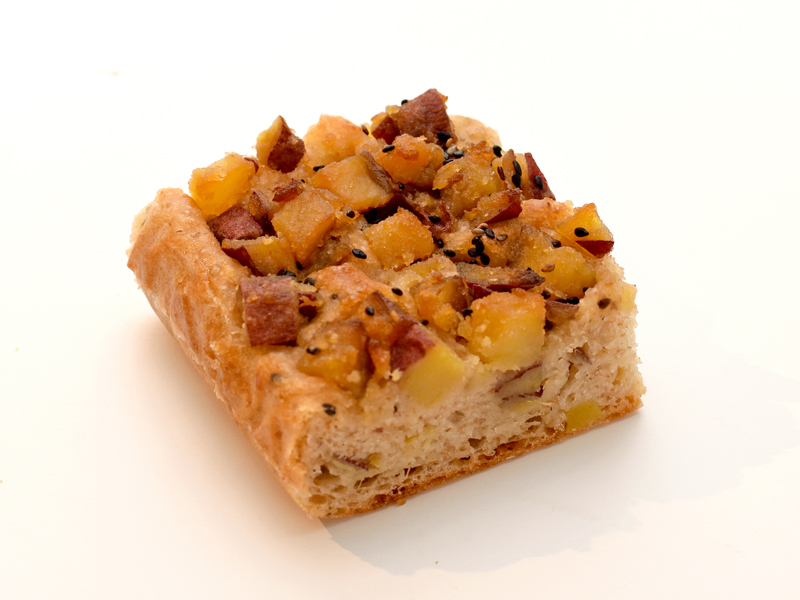 当店は、創業当初から「しっとりとしてパサパサしないスコーン」を目指しており、今回の「さつまいも」のお題に対して、当店らしく作り上げることを念頭に置きました。 過去に「さつまいもスコーン」を販売したことがあり、それとは違うスコーンを検討し、「大学芋」のようなスコーンを目指しました。 現在取り組んでいる四角い形で、生地が層になっていて、シンプルな素材で、粉の風味・バターの香りが楽しめるスコーンがあり、このスコーンに「さつまいものペースト」をはさみ込みました。 スコーンが生きるように、ホクホクしたさつまいもが良いと思い、品種は紅あずまに決め、ホクホク感を残しながら味付けをし、スコーン生地に挟み込んで焼き上げ、大学芋のように甘からいたれを付けて、黒ゴマを乗せました。