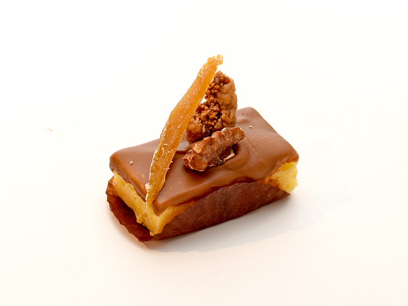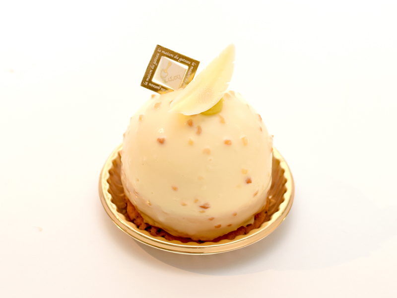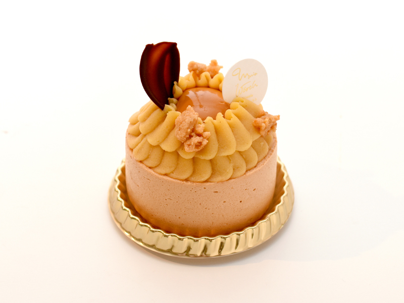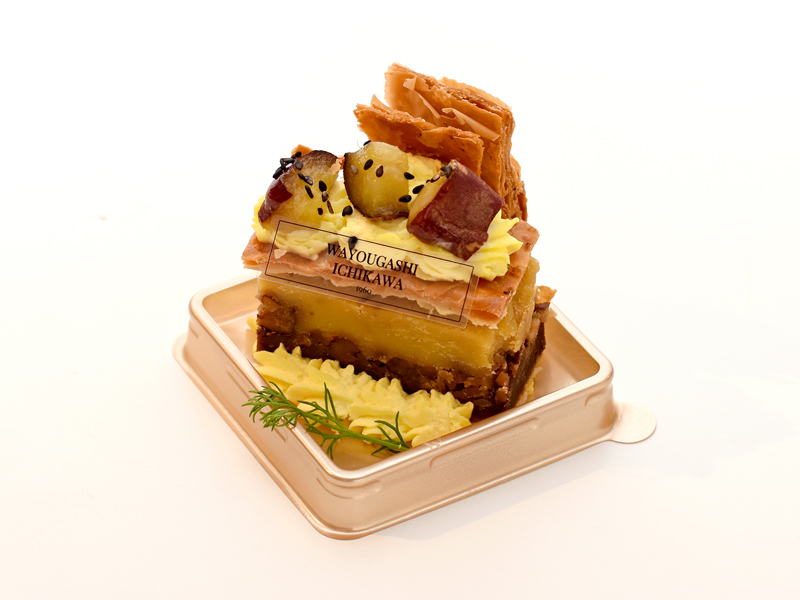 マスカルポーネムースの中に芋のテリーヌと紅はるかのダイスカットを入れ、 キャラメルムースとの2 層にして下にジョコンドとゴマサブレをいれ仕上げました。 仕上げに、グラサージュブランをかけました。